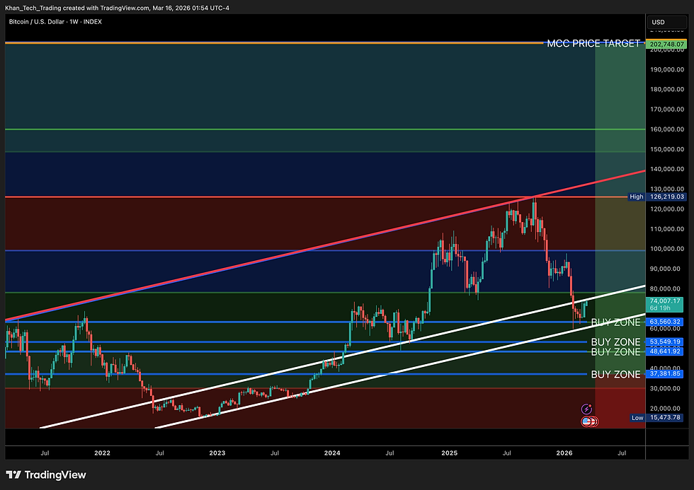 Interpretation: BTC remains a core risk-on-cycle asset, MCC engages only via predefined buy zones and rotates out near the $202,748 target or on structural failure.